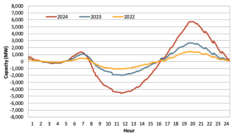 図1. カリフォルニアで蓄電池による日中の充電と夕方の放電の進展