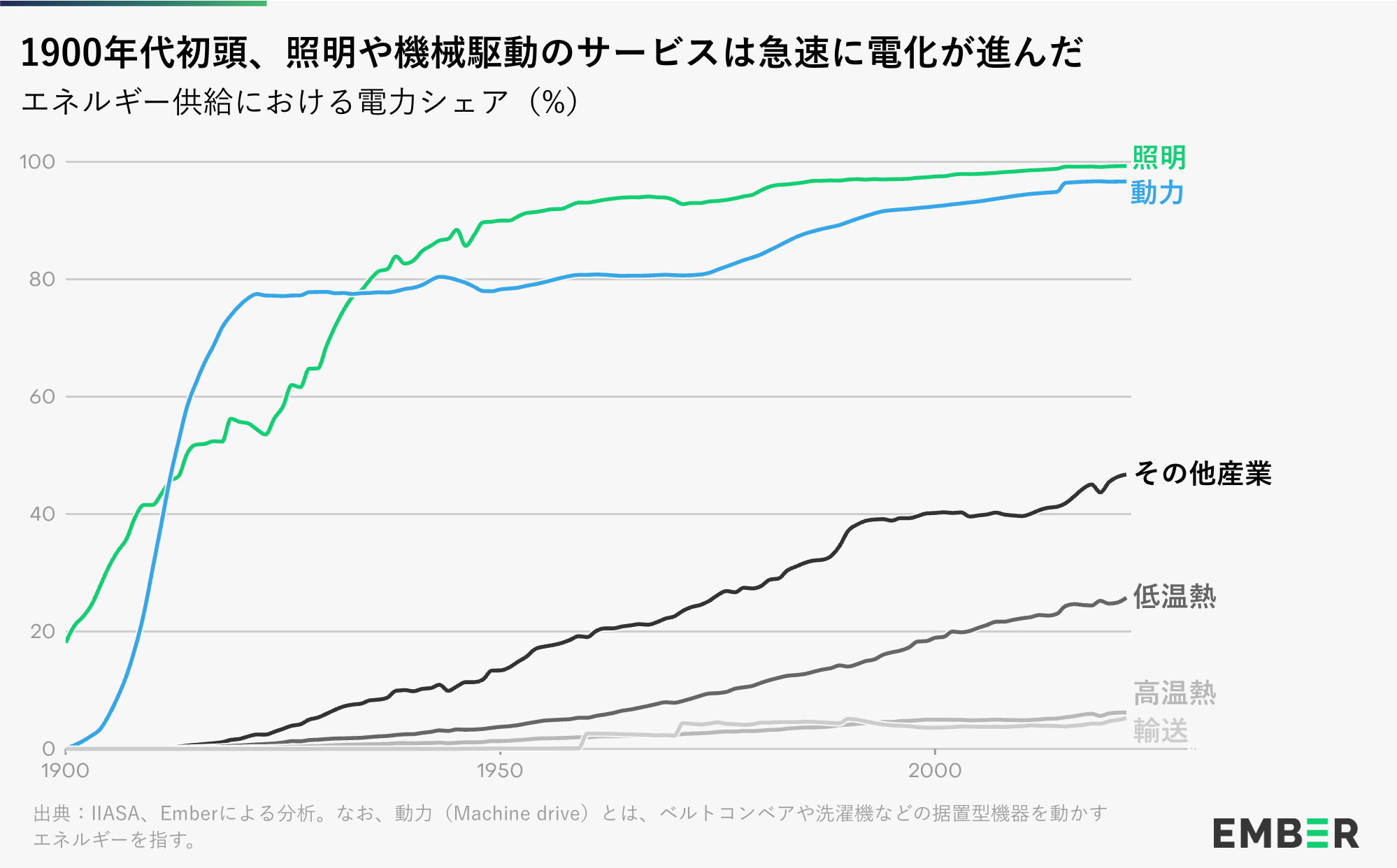 本稿は、世界のエネルギーシステムの根幹としての電力の100年にわたる隆盛をたどる、Emberの電化シリーズ の第2弾です。電化の歴史的な勢いと、化石燃料を代替する役割の加速について探求します。