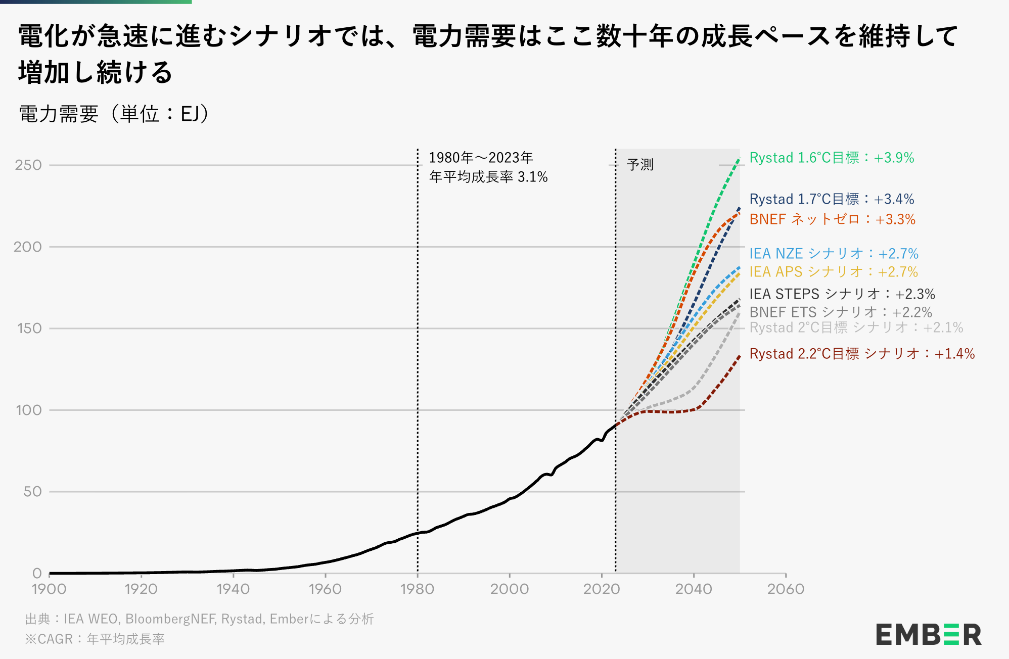 しかし、現実はもっと驚くべきものだ。急速な電化は、ほとんどの大胆な脱炭素化シナリオで想定されている規模であっても、世界の電力需要の伸びの大幅な加速を必要としない。ほとんどのシナリオでは、世界の電力需要は2050年まで年率約3%で成長すると想定している —— これは1980年以来、電力が享受してきたのと同じ成長率である。もちろん、一部の地域ではより速い成長を意味するだろう。今後の記事で探るように、OECDの成長は著しく鈍化しており、加速が必要になるだろう。しかし世界レベルでは、深い電化は本質的に、長年にわたる電力需要の成長トレンドの延長線上にある。