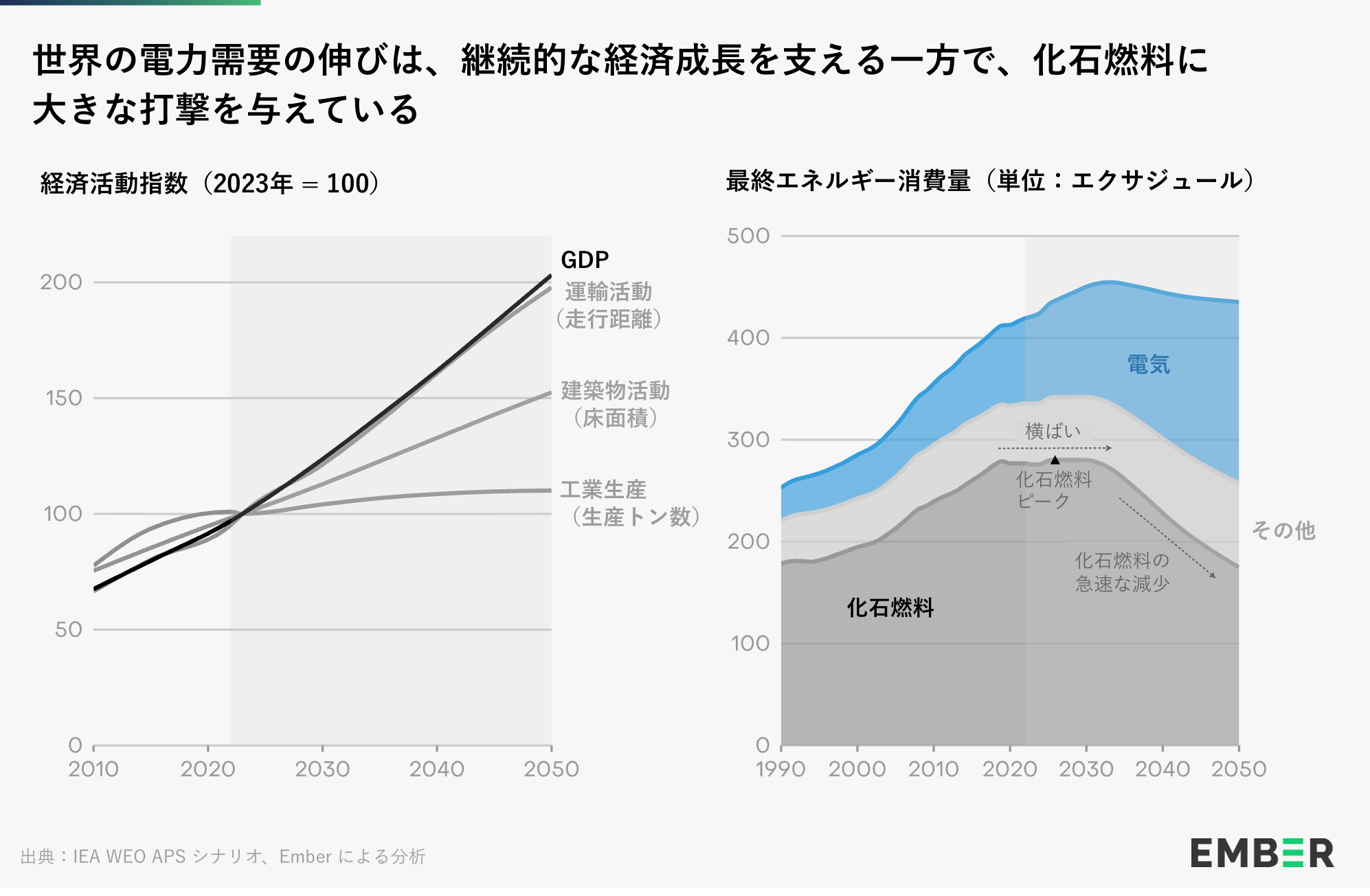 - 成長の3分の2はすでに電力によるものだ。2018年から2023年の間に、世界の最終エネルギー需要の増加の63%を電力が占め、化石燃料はわずか5%しか貢献していない。この傾向が続けば、大きな変化が起こる。電力需要が年間約3%のペースで成長し続ければ、今世紀末までに最終的な化石燃料の需要が構造的に減少する可能性がある。