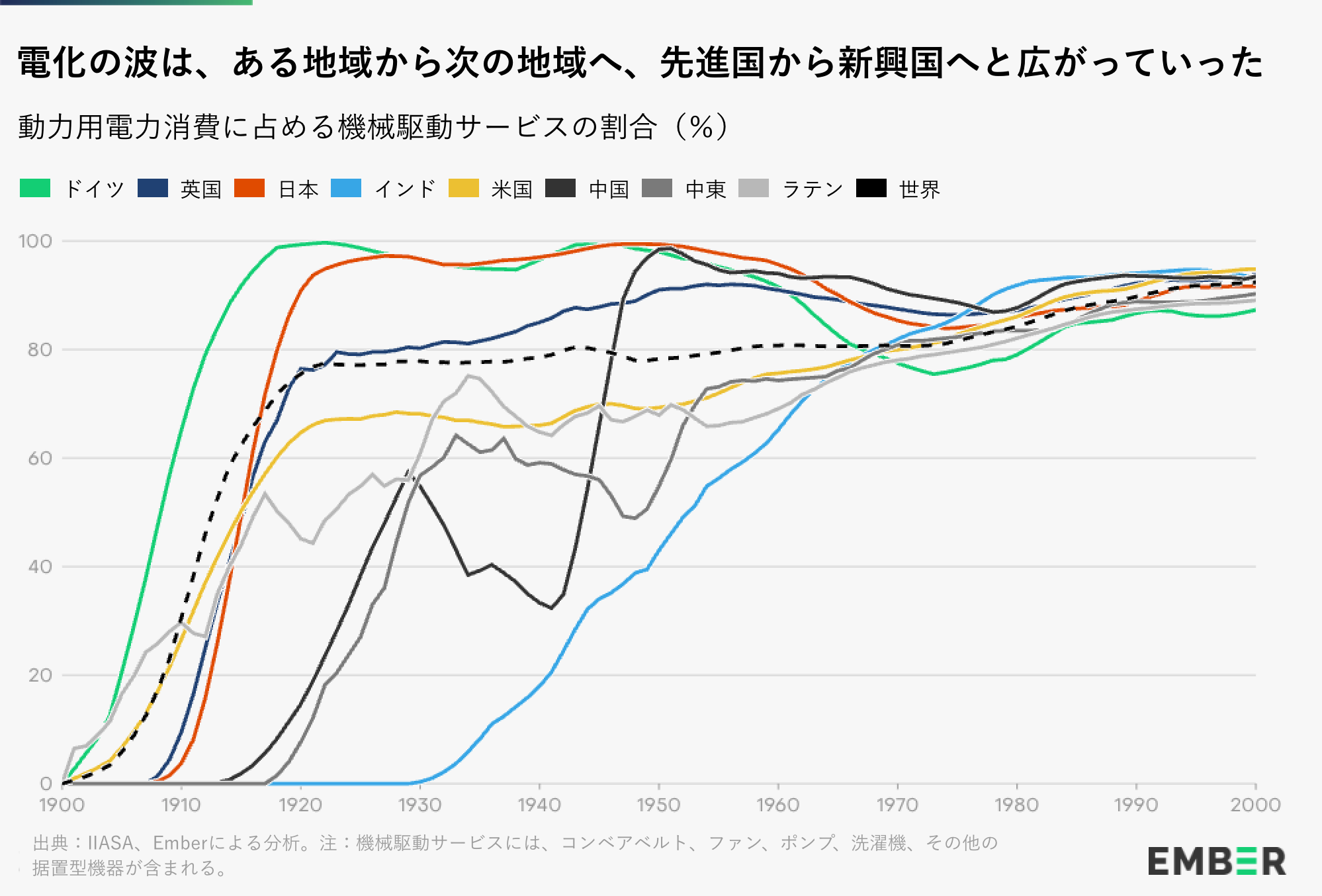元記事:The Electrotech Revolution “The long march of electrification: A century of growth in electricity has brought us to the Age of Electricity” Jul 22, 2025 = Ember “The long march of electrification: A century of growth in electricity has brought us to the Age of Electricity” Jun 25, 2025. ライセンス:“Creative Commons Attribution 4.0 International Licence (CC BY 4.0)” ISEPによる翻訳