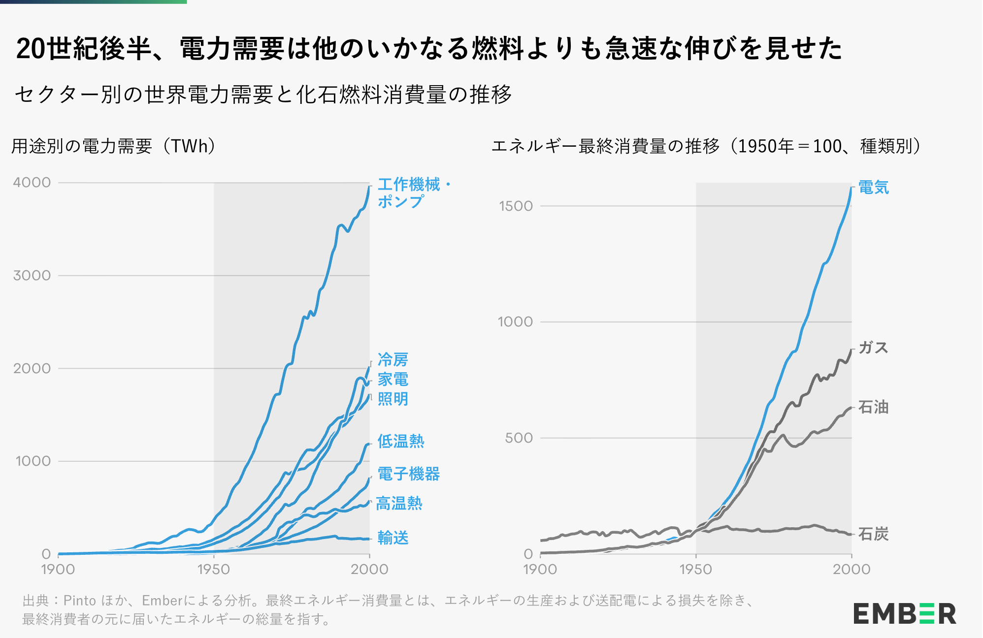 第二次世界大戦後の期間は、世界経済の劇的な拡大を記録した。欧州の復興、アジアの工業化、北米の消費ブームにより、ほぼすべての地域と分野でエネルギー需要が急増した。しかし、電力は際立っていた —— 単にペースを維持するだけでなく、もっとも急速に拡大する化石燃料さえも凌駕していたのである。1950年代と1960年代、世界の電力消費量は年率約6%で増加し、石油やガスよりも約20%速いペースで成長した。