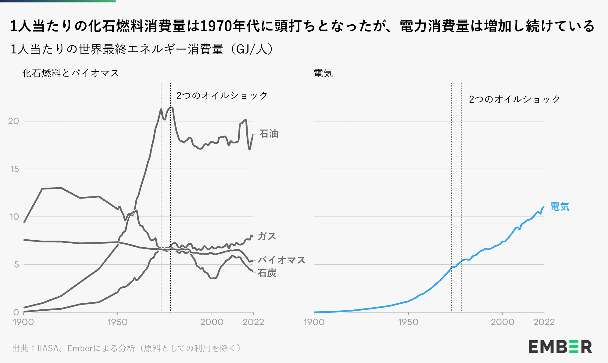 1970年代のオイルショックは、世界のエネルギーシステムに激しい衝撃をもたらした。数十年続いたほぼ継続的な成長の後、世界のエネルギー消費は停滞し始めた。下図に示すように、石油、石炭、ガスの1人当たりの消費量は1970年代に横ばいとなり、それ以来横ばいのままである。