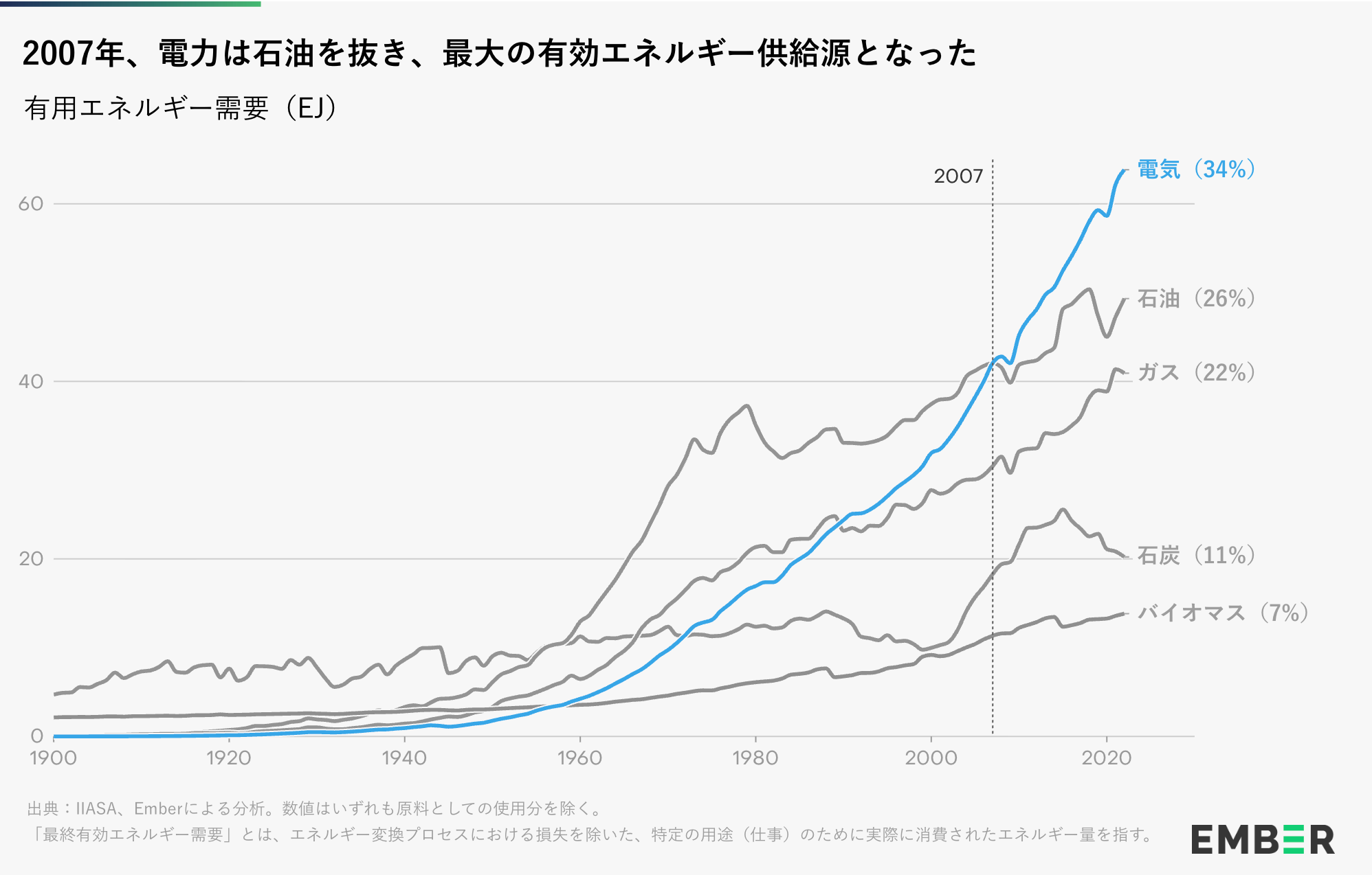 - 電力は有用エネルギーの3分の1を占めている。1970年代のオイルショック以降、1人当たりの最終エネルギー需要の増加はすべて電力によって賄われており、2007年には石油を追い抜き、有用エネルギーの最大の供給源となった。最終エネルギーとしての化石燃料の需要は、すでに3分の2の国でピークに達しており、産業部門では2014年、建物部門では2018年、道路輸送部門ではおそらく2019年ごろに頭打ちになっている。
