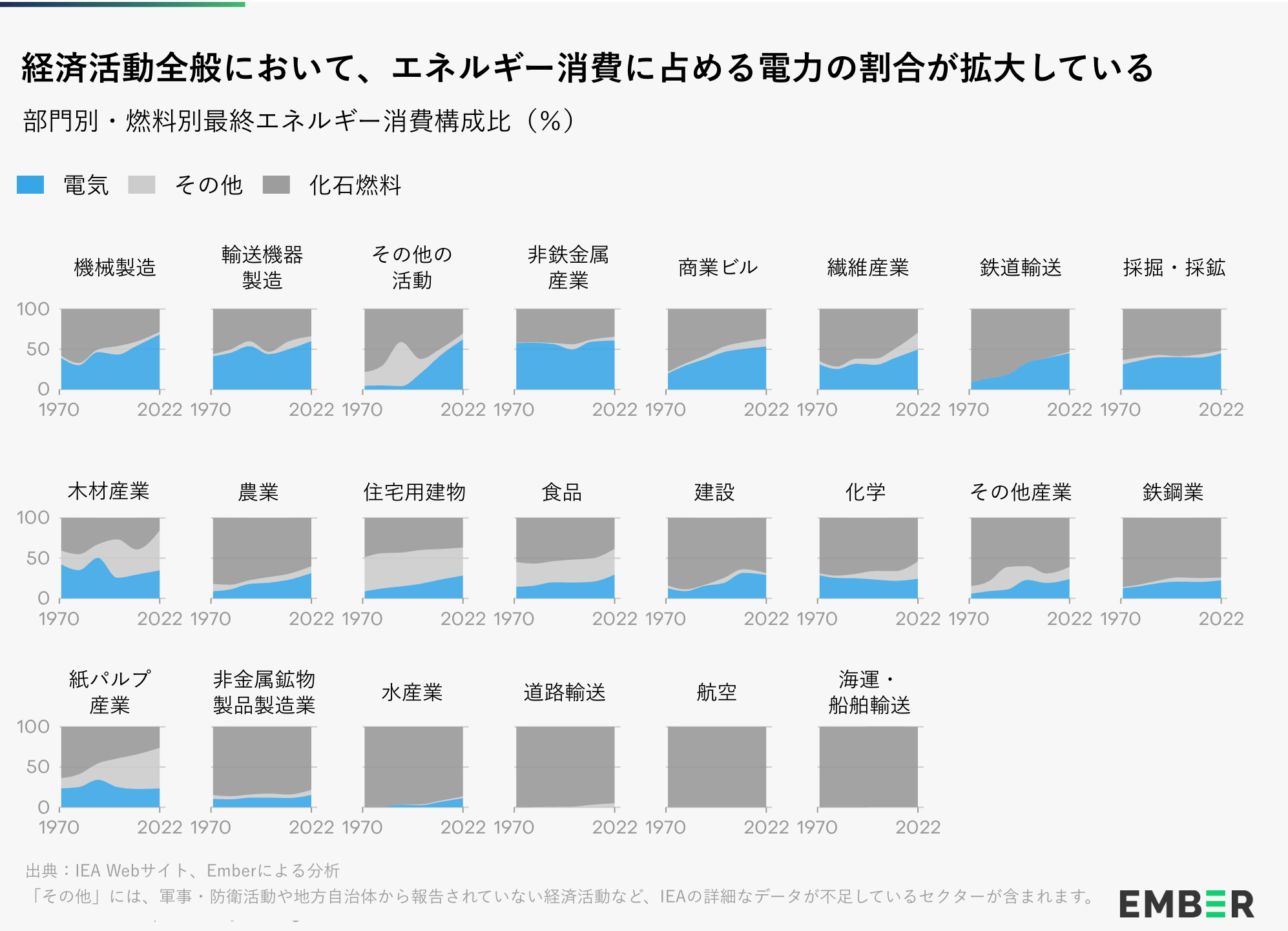 電化が深まるにつれ、化石燃料消費への影響はより顕著になっている —— 相対的な比率だけでなく、絶対的な量においても。1980年代以降、最終エネルギー消費に占める電力の割合は、ほぼすべての部門で増加している。