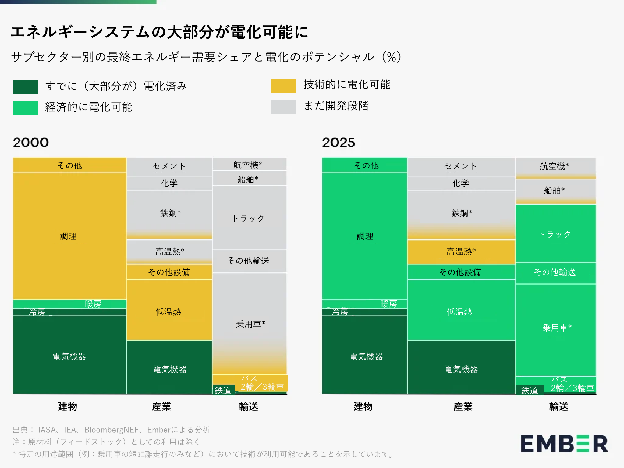 過去20年間で、他分野の電化に対する主要な技術的障壁は着実に低下してきた。初期の電気自動車(EV)は航続距離の短さとトルクの低さに悩まされ、ヒートポンプは暖房需要がもっとも高い寒冷地で苦戦していた。EVの航続距離と出力が向上し、新世代のヒートポンプが寒冷な条件下でも効果的に動作するようになったことで、これらの制約は大幅に解消された。