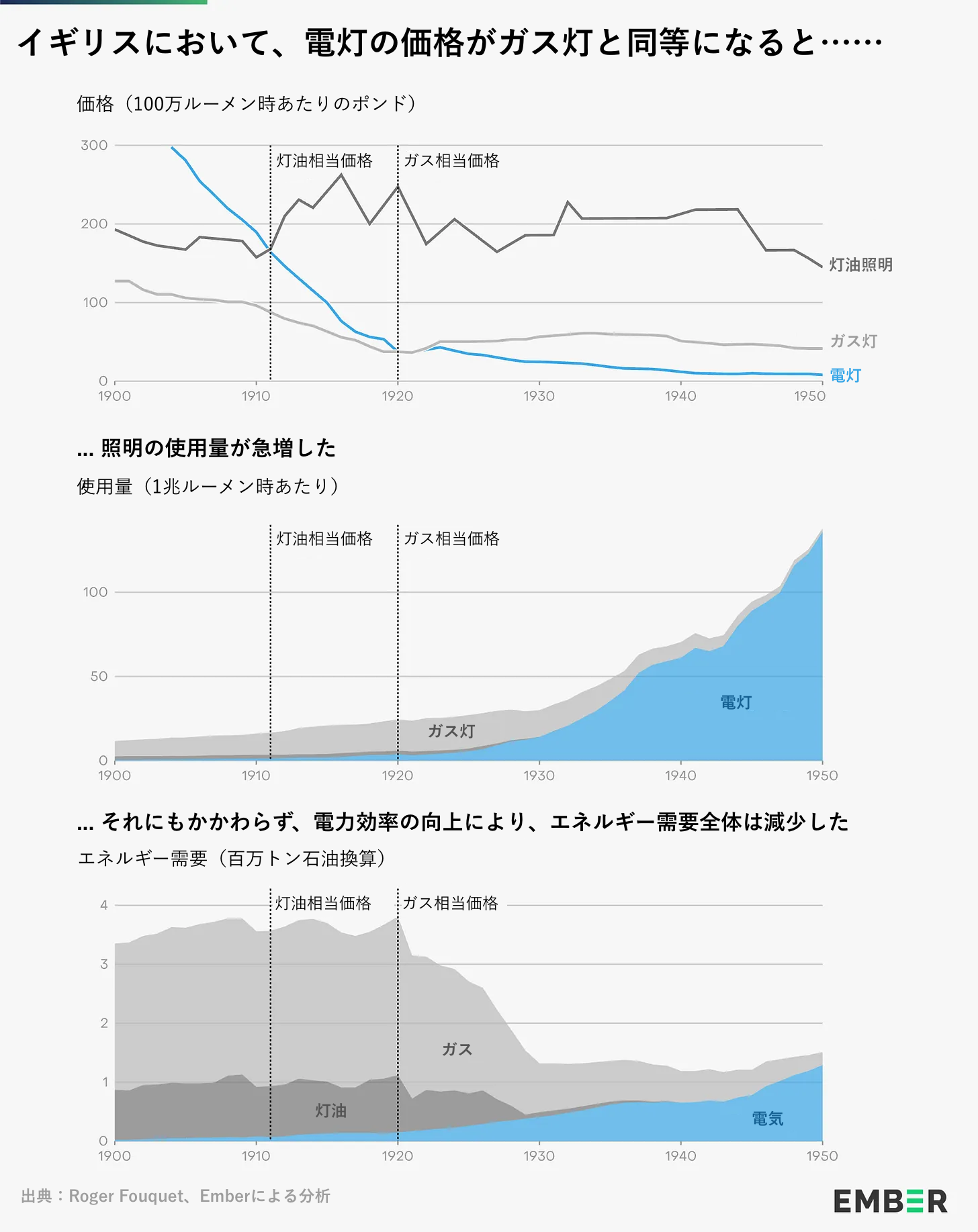 英国における電気の普及期、特に電灯に関する以下の記述は、電気照明の価格が1920年頃にガス灯と同等のコストになった途端、いかに急速に移行が進んだかを示している。電灯の需要が急速に増加するにつれて、照明用ガスへの需要は急速に減少した。興味深いことに、最終エネルギー需要自体も60%減少している。これは、電気が光を生成する効率がはるかに高いためである。1920年代を通じてガス需要が急速に減少した背景には、「帆船効果(sailing ship effect)」と呼ばれる現象も影響している。これは、蒸気船が登場したときに帆船の効率が向上したように、より優れた新たなテクノロジーからの競争圧力に対応すべく、既存のテクノロジーが革新と効率改善を爆発的に進める現象である。